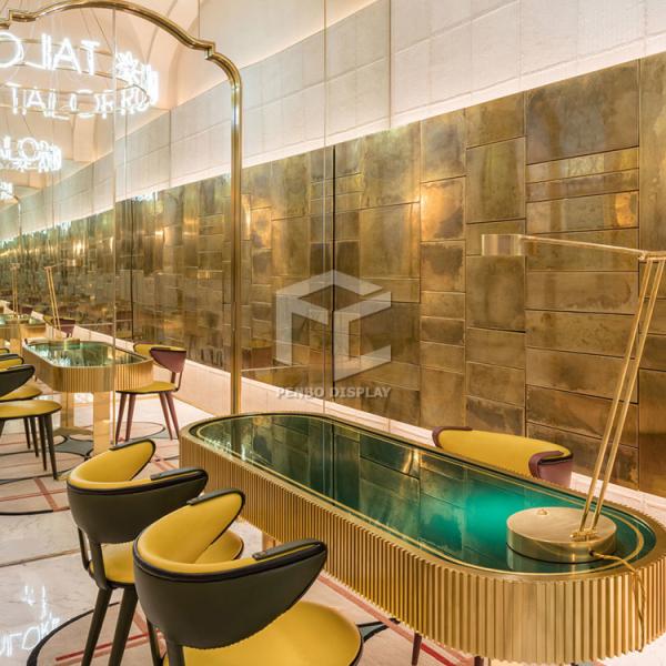 The material for this store it is stainless steel with MDF white painting. Stainless steel with golded electroplated. Inside the shelves with led strip lights. The chairs are made by stainless steel and velvet.